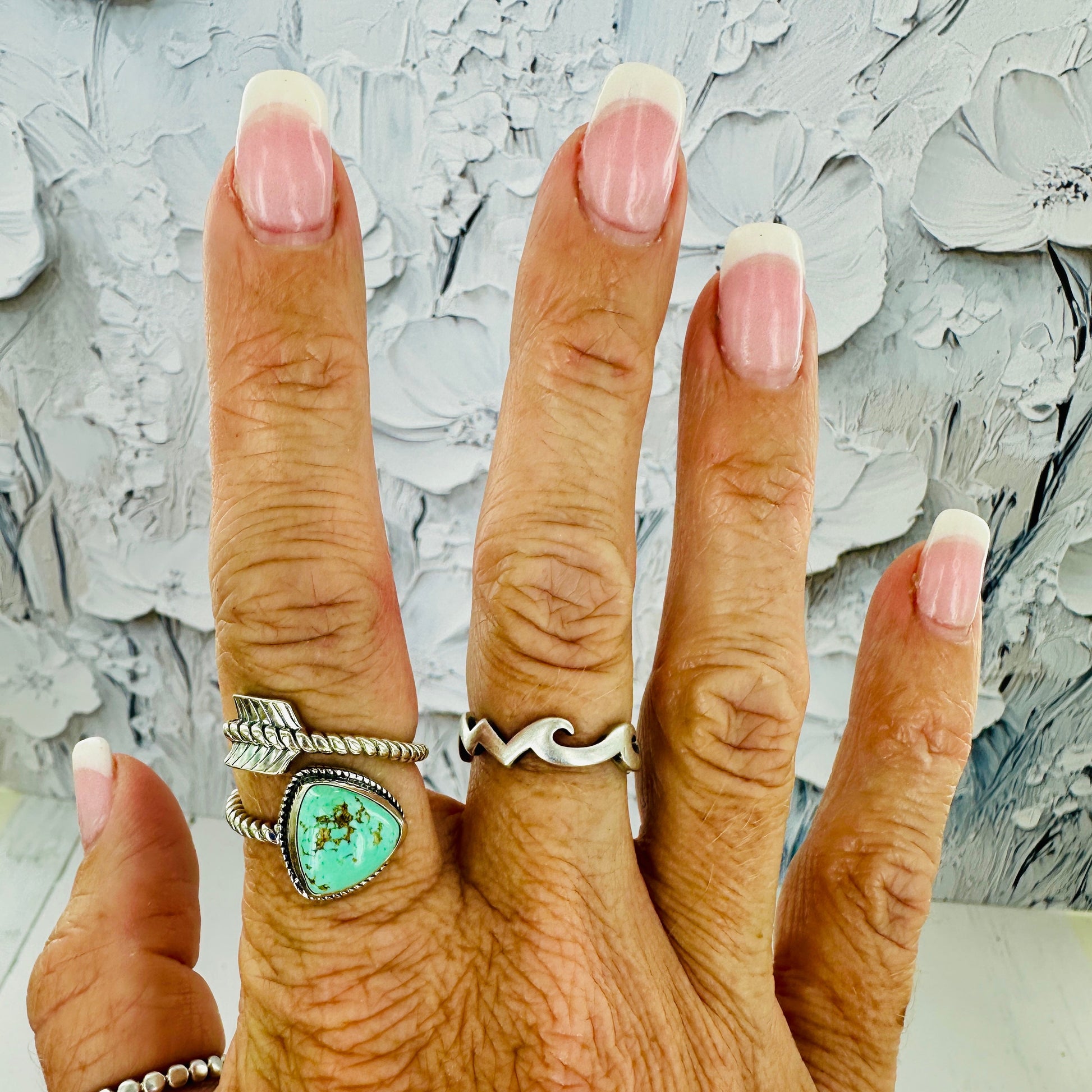 Handcrafted sterling silver ring featuring a striking Sierra Nevada turquoise stone wrapped and shaped to resemble an arrow pointing forward. The turquoise's natural blue-green hues are framed by polished silver bands that guide the eye along the arrow's direction, creating movement and intention. Perfect for those drawn to southwestern aesthetics and meaningful symbolism. Each piece celebrates the raw beauty of natural stone.
