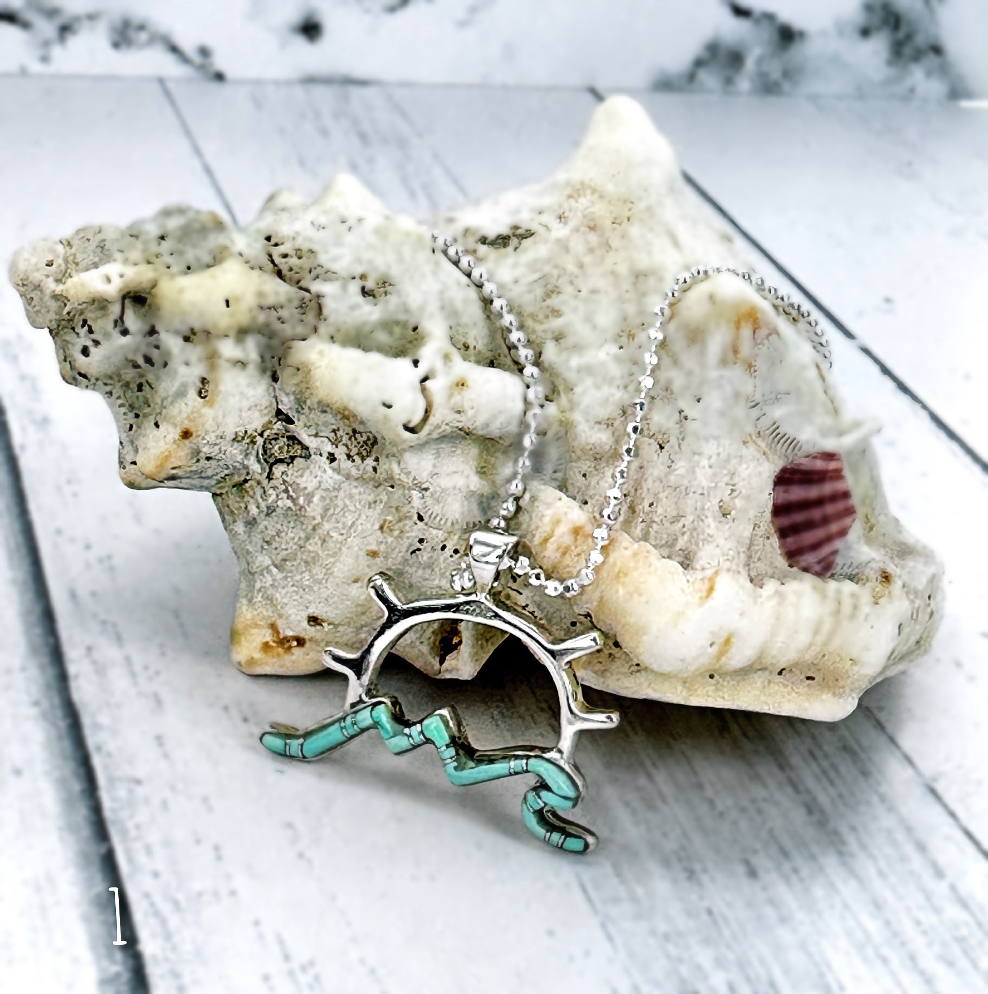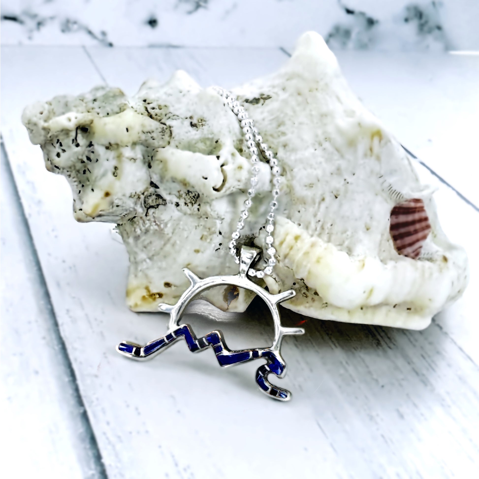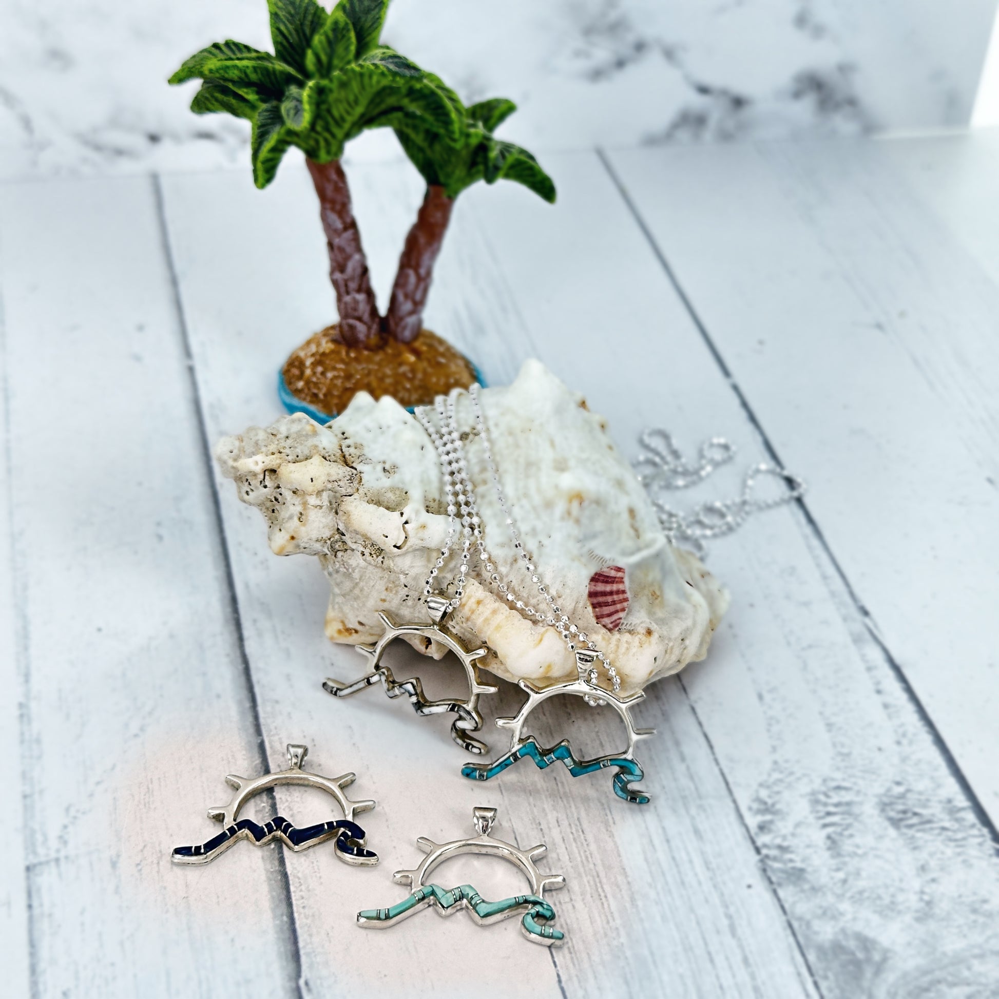 Explore a connection between land and sea with this breathtaking necklace! Featuring a sterling silver inlay of turquoise, sodalite or white buffalo, its unique design brings the majesty of the mountains to the serenity of the ocean, all under the delight of the sun’s warm rays. Get ready to go from "mountains to the ocean" in style!