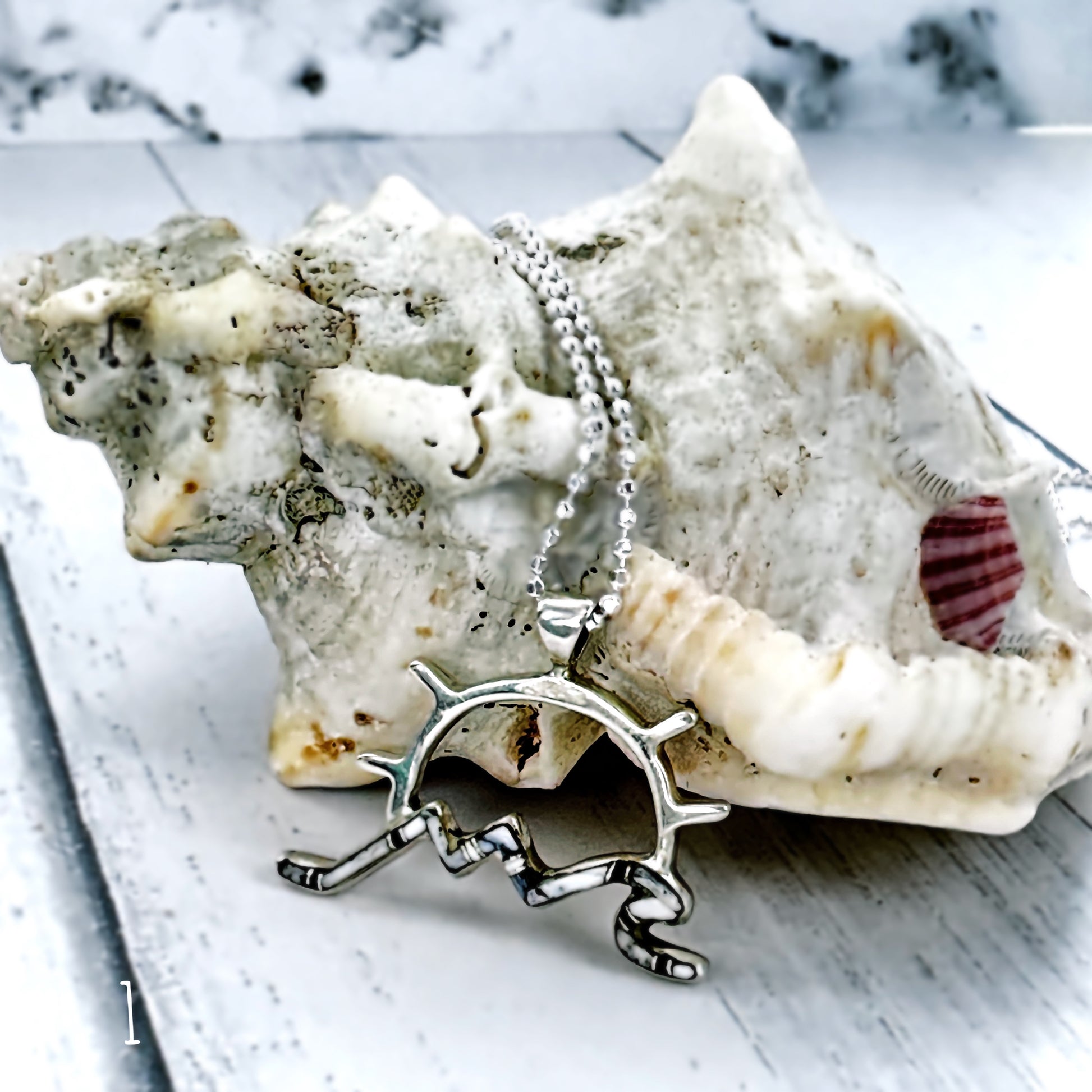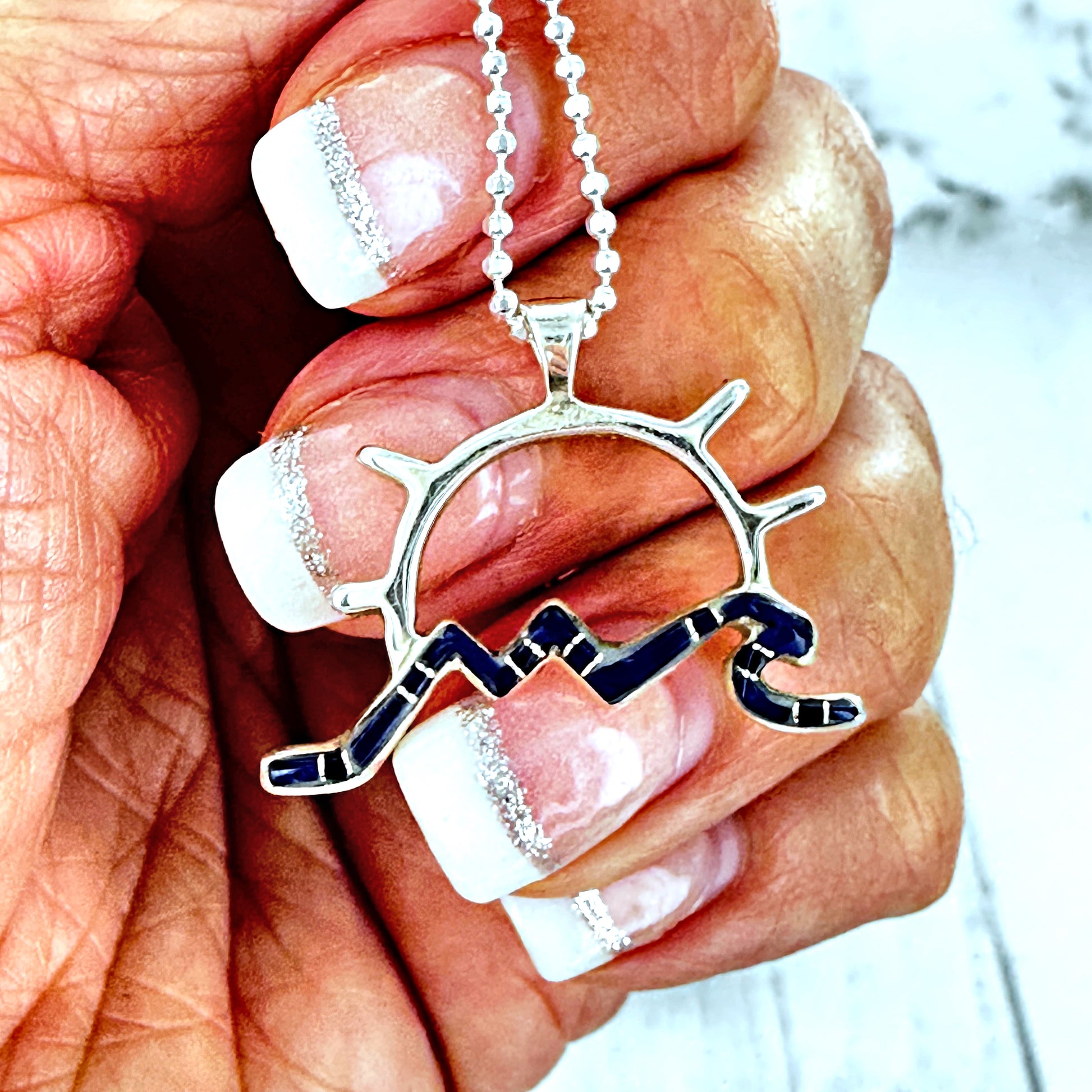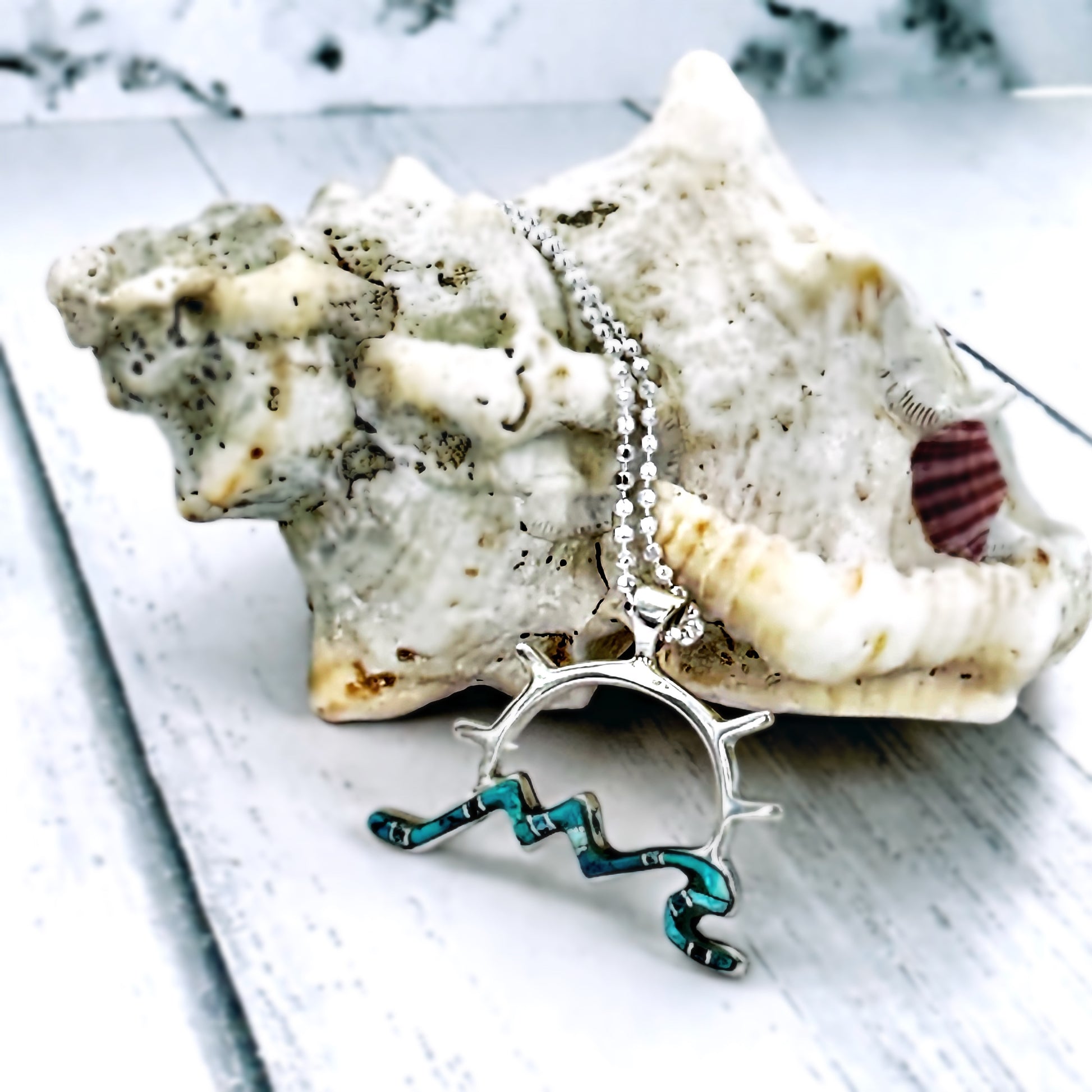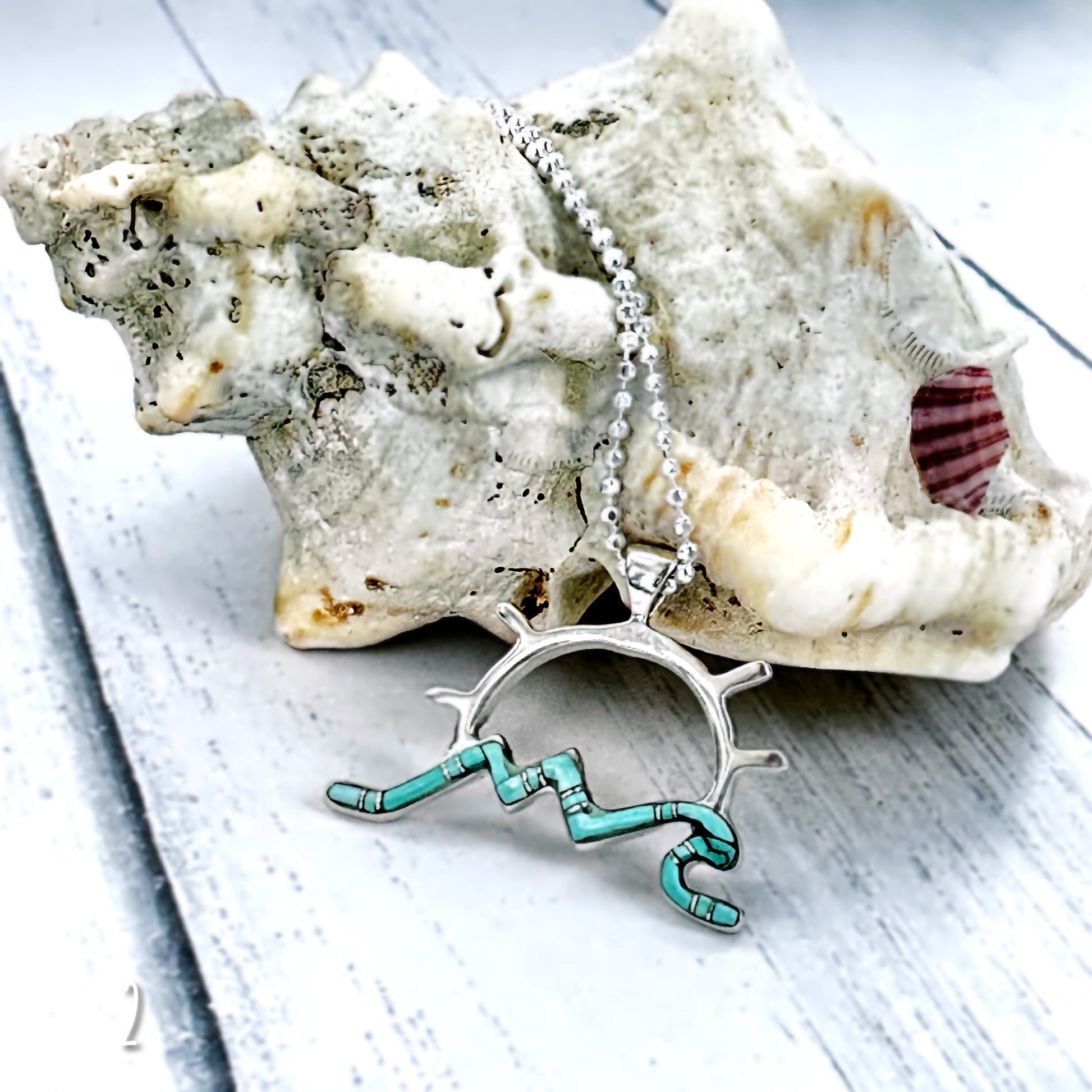Explore a connection between land and sea with this breathtaking necklace! Featuring a sterling silver inlay of turquoise, sodalite or white buffalo, its unique design brings the majesty of the mountains to the serenity of the ocean, all under the delight of the sun’s warm rays. Get ready to go from "mountains to the ocean" in style!