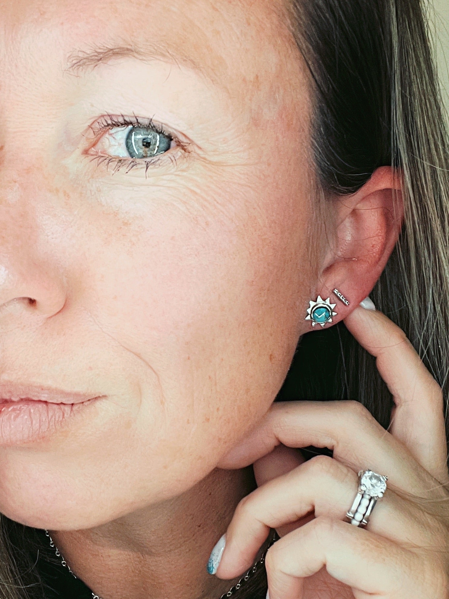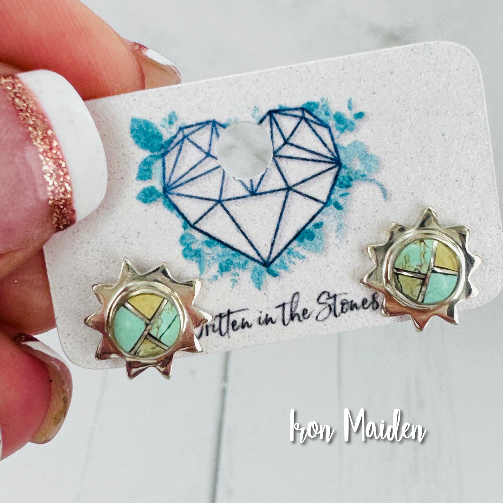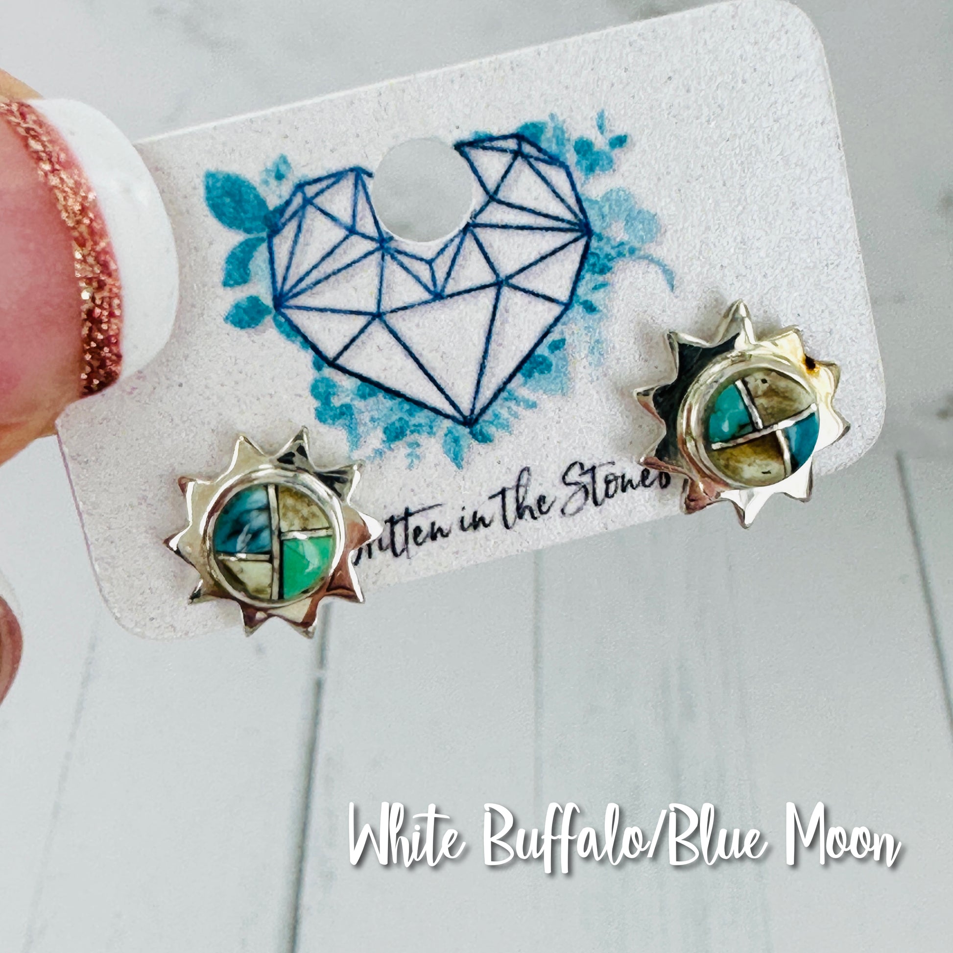 These small sun studs are made with natural turquoise. Each piece of turquoise, white buffalo or variscite (poseidon) has been mined by us. (the Otteson's) it is inlayed with sterling silver.
