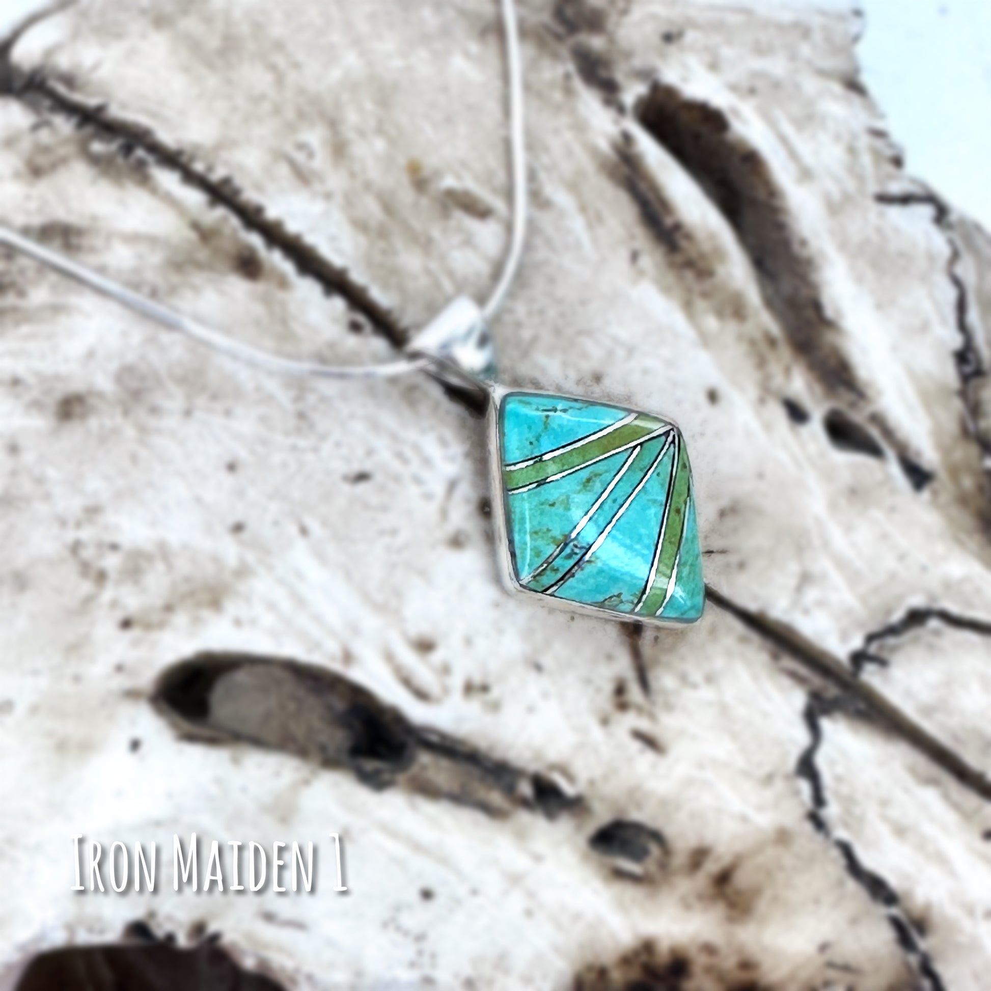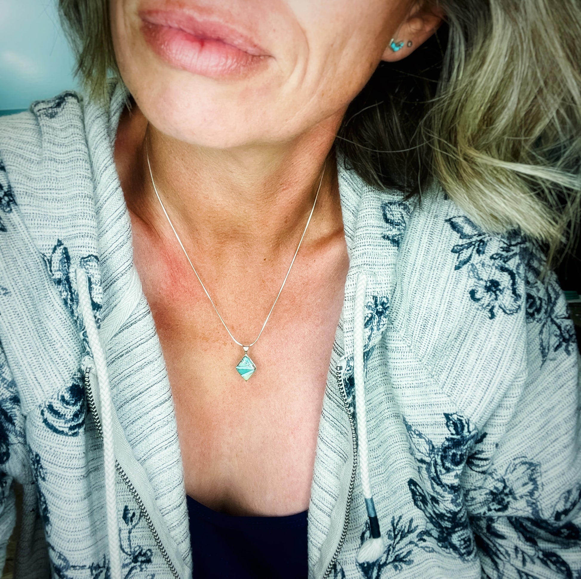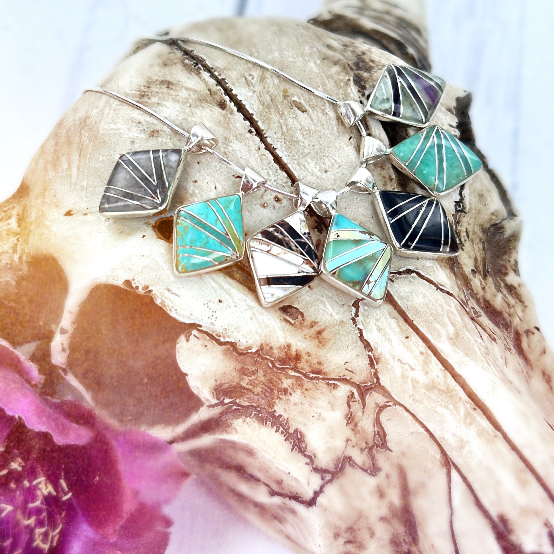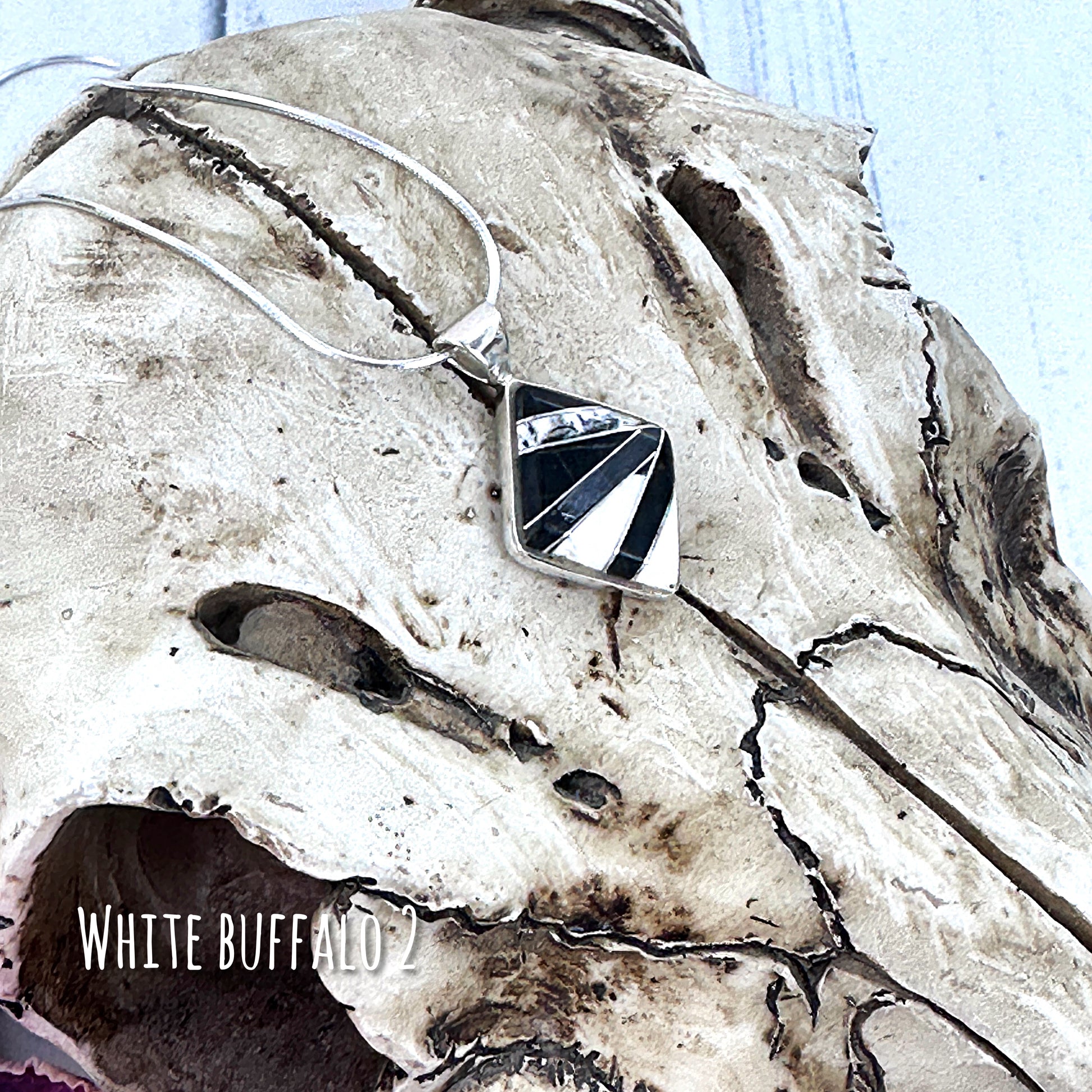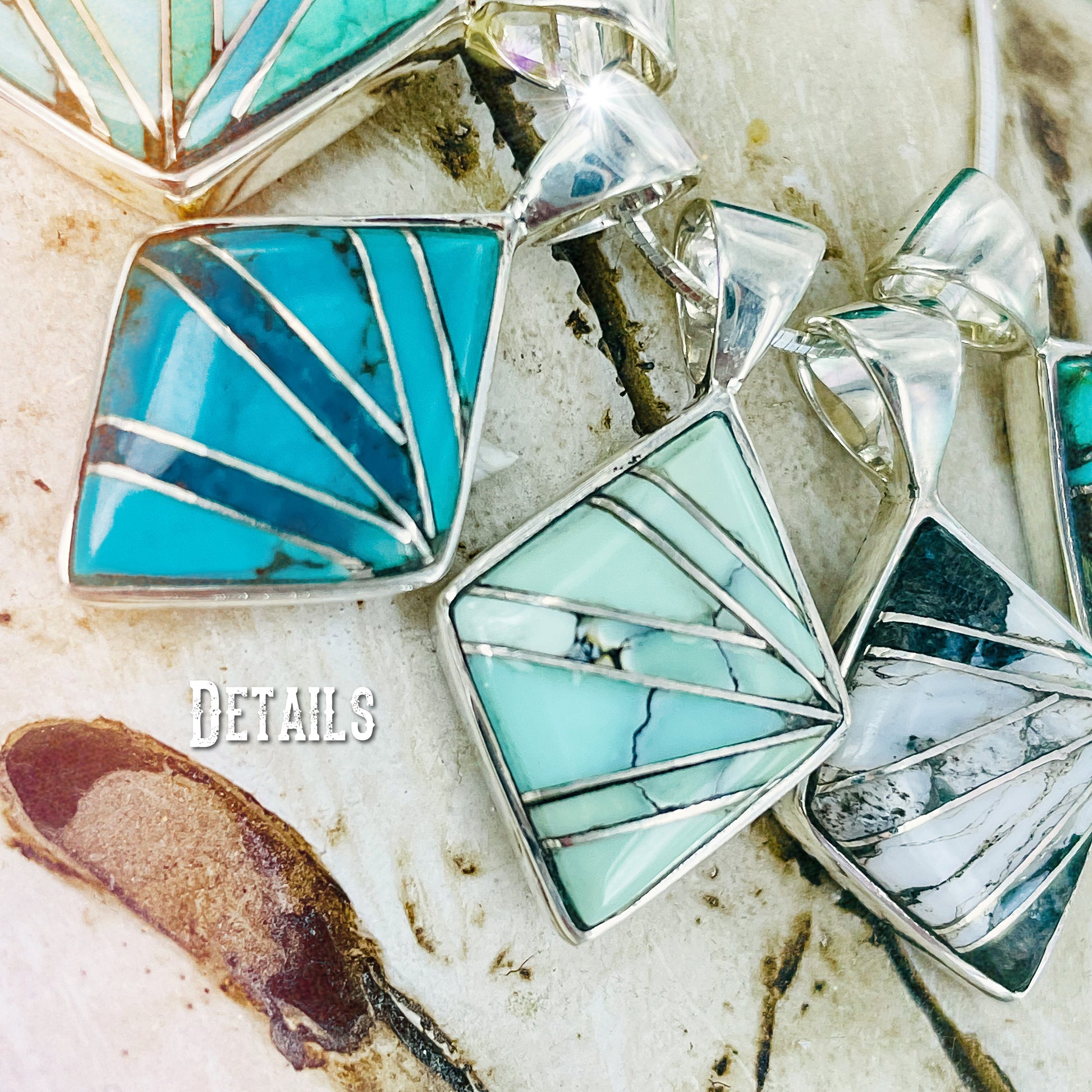 Our Maverick Necklace is a diamond-shaped turquoise, white buffalo, chrysoprase, blue tigers eye, rose quartz or fluorite inlay pendant. It's made from sterling silver and comes with an adjustable 18" snake chain.
