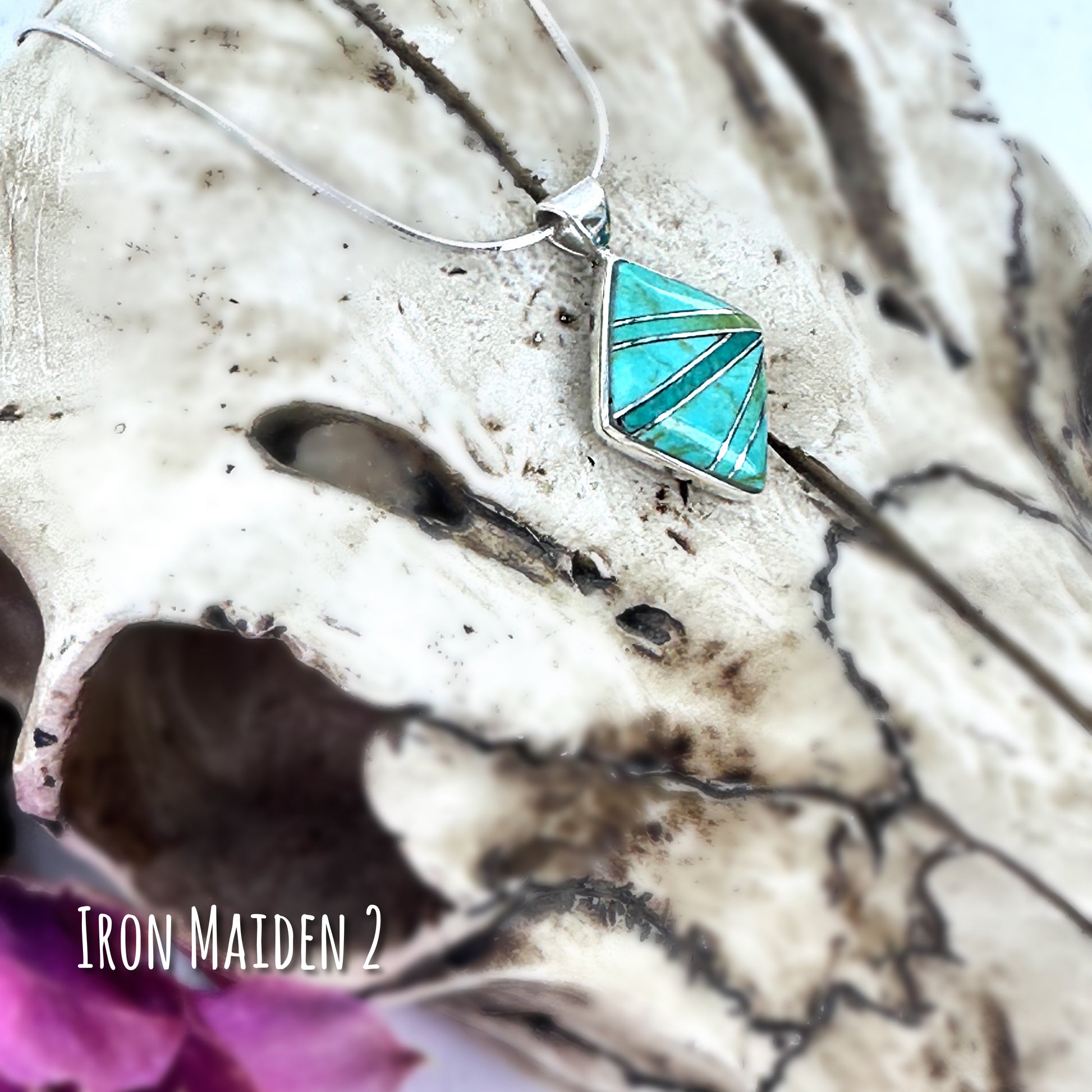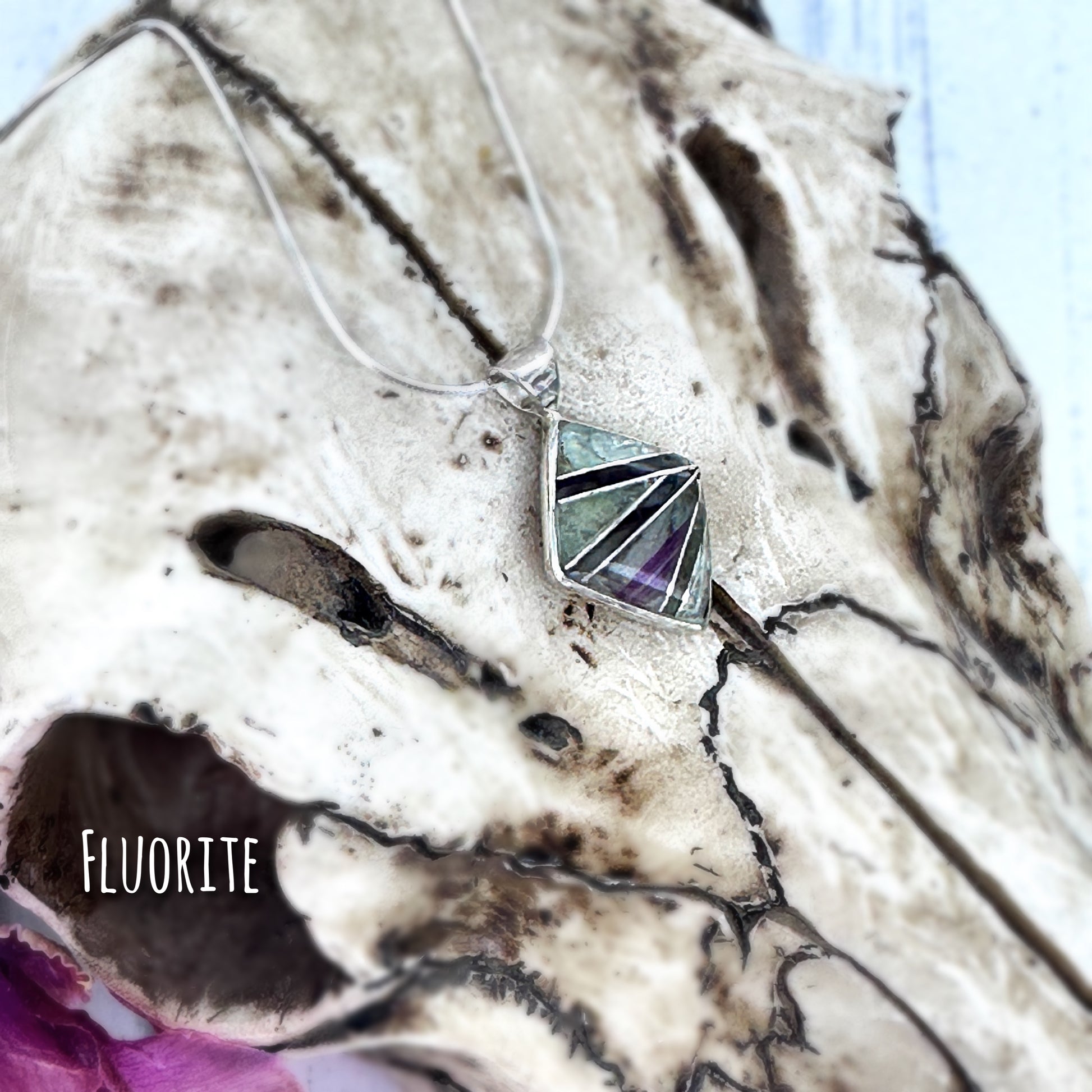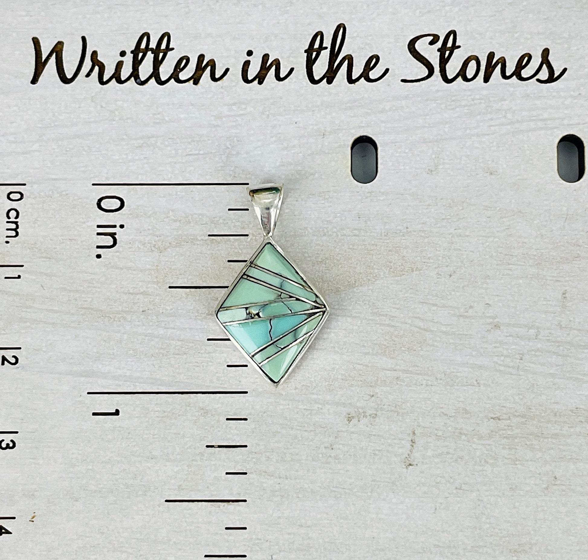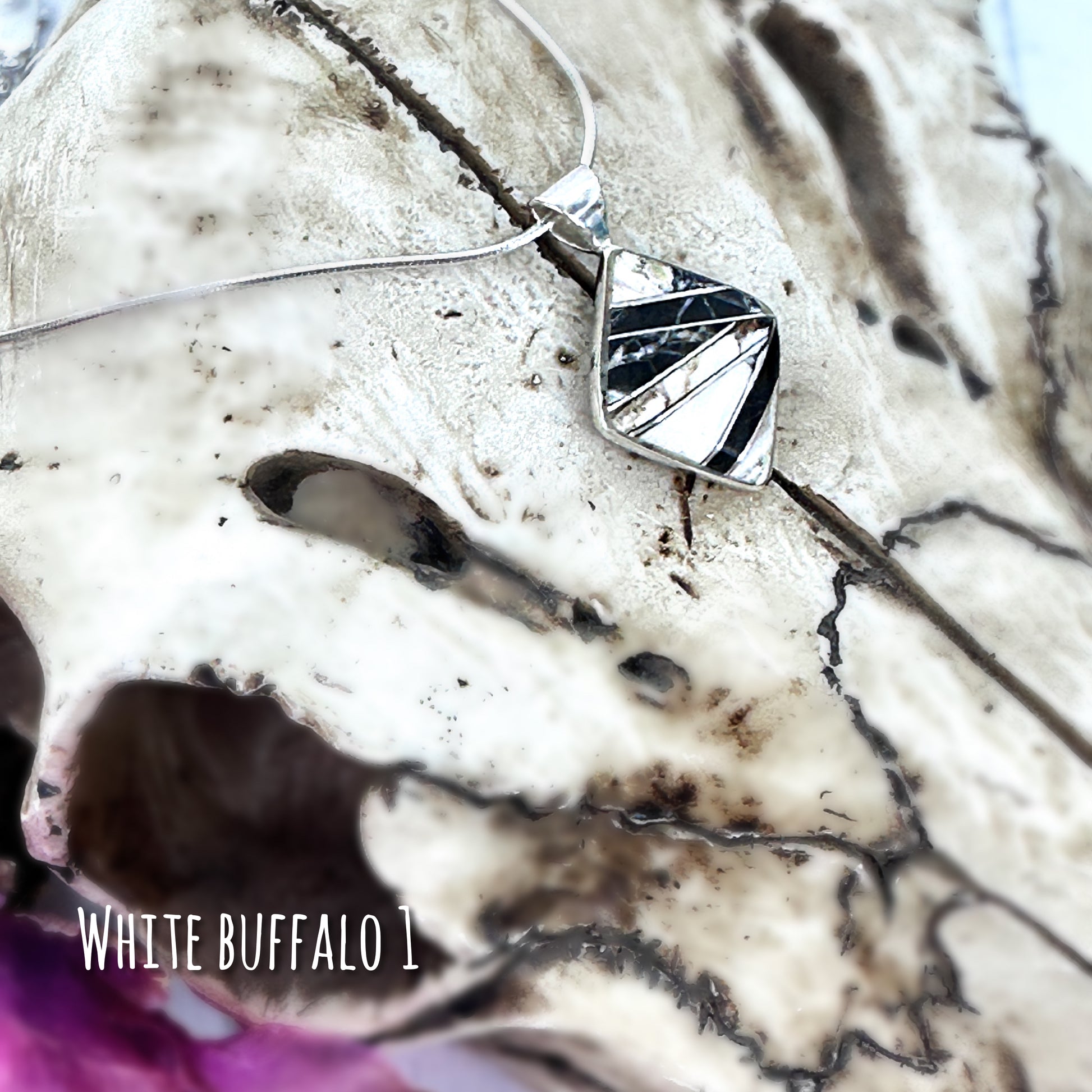 Our Maverick Necklace is a diamond-shaped turquoise, white buffalo, chrysoprase, blue tigers eye, rose quartz or fluorite inlay pendant. It's made from sterling silver and comes with an adjustable 18" snake chain.