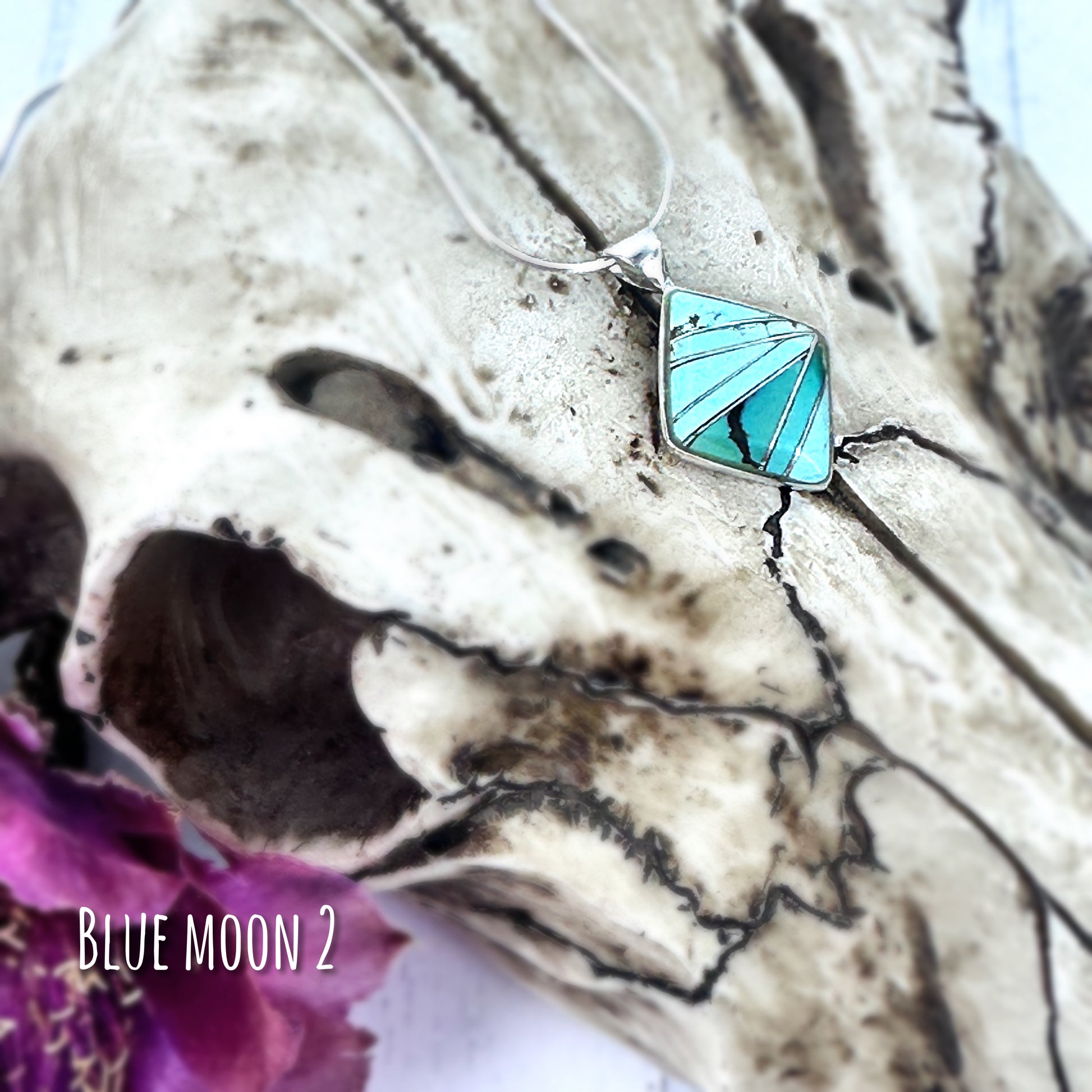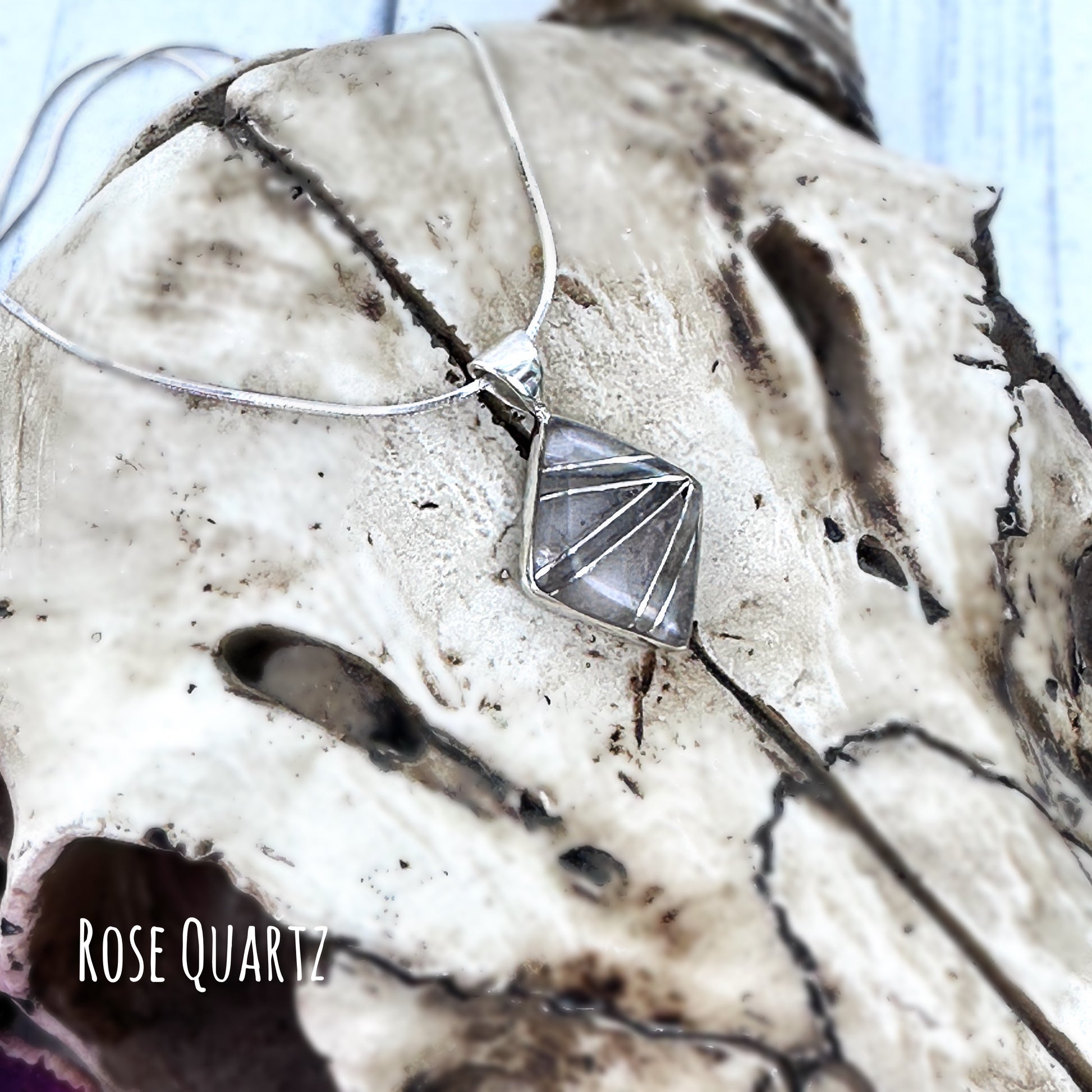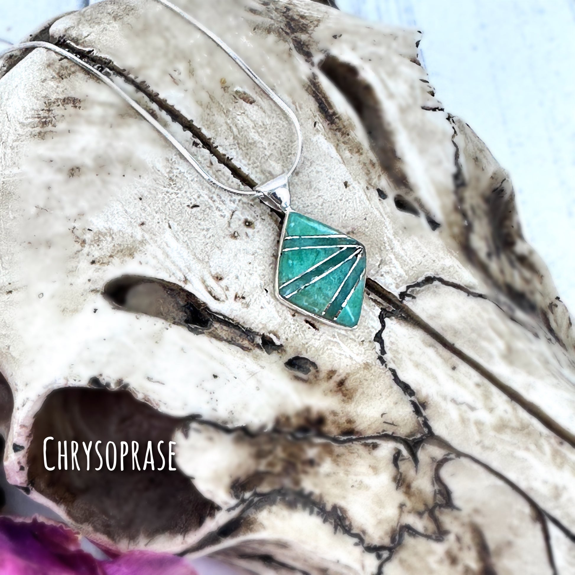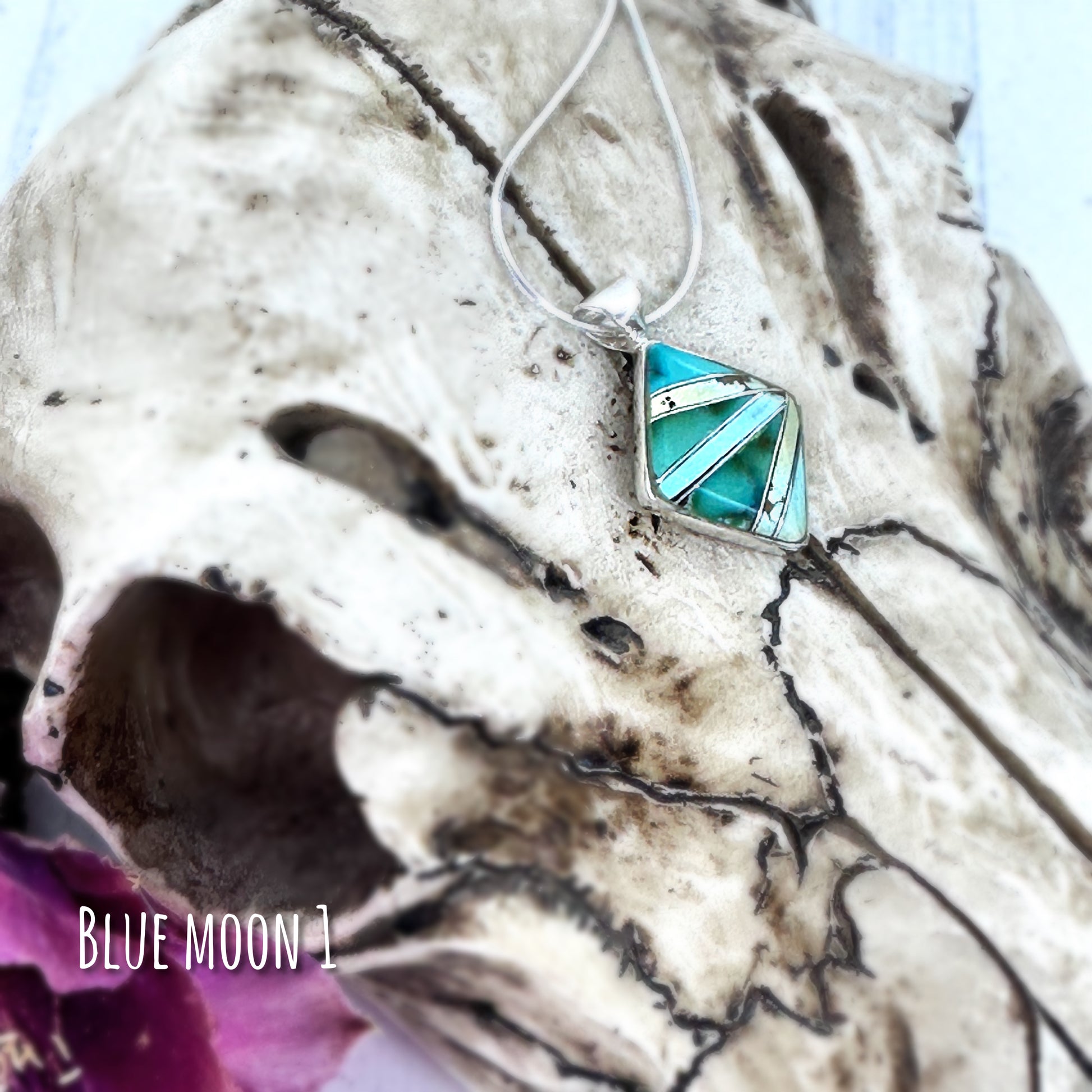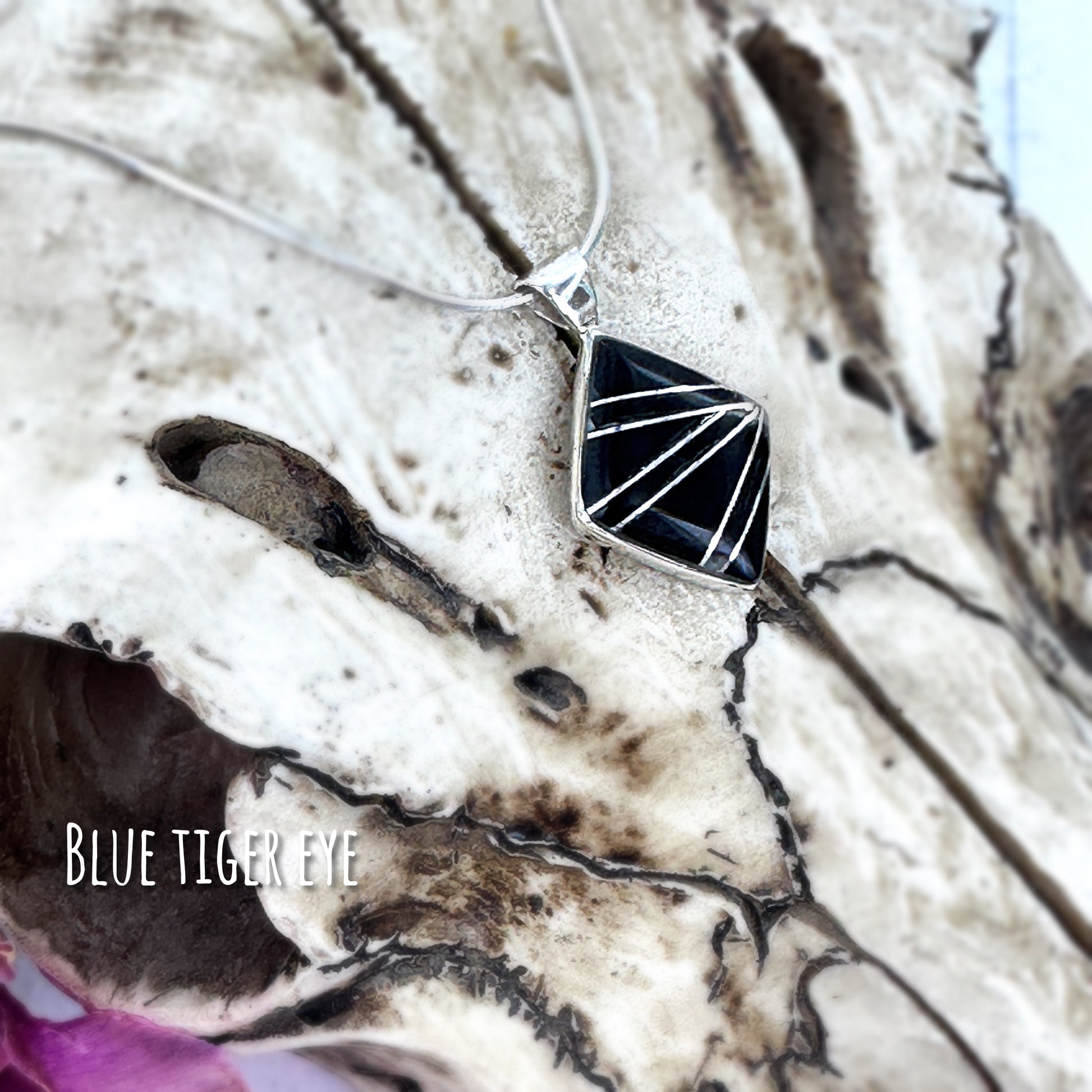 Our Maverick Necklace is a diamond-shaped turquoise, white buffalo, chrysoprase, blue tigers eye, rose quartz or fluorite inlay pendant. It's made from sterling silver and comes with an adjustable 18" snake chain.