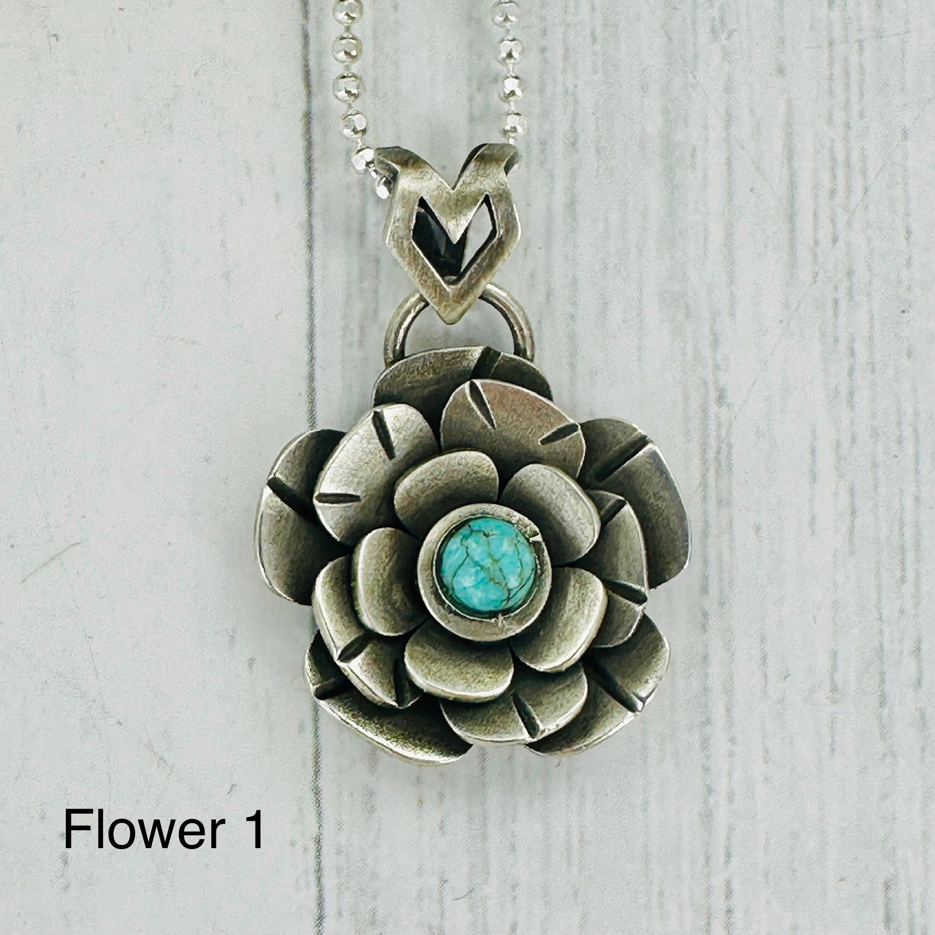 This sweet flower pendant features a Blue Moon turquoise stone with sterling silver flowers. The flowers have been patinated and given a matte finish.