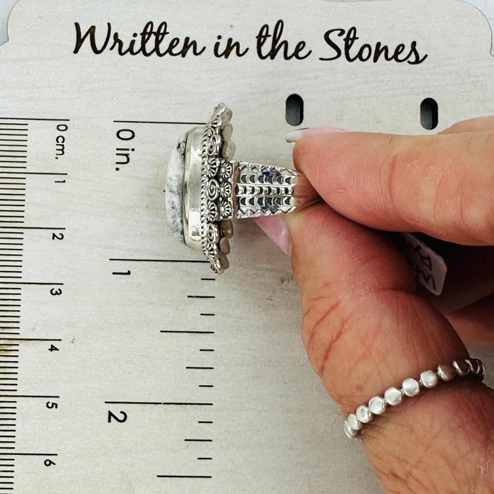 This striking white buffalo stone ring features an oval cabochon stone witt the ring measuring just over 1" in length, set within an ornate bezel that showcases intricate detailing. The band displays a carefully crafted shank with decorative elements that frame the stone beautifully. A statement piece that combines natural beauty with artisanal metalwork.
