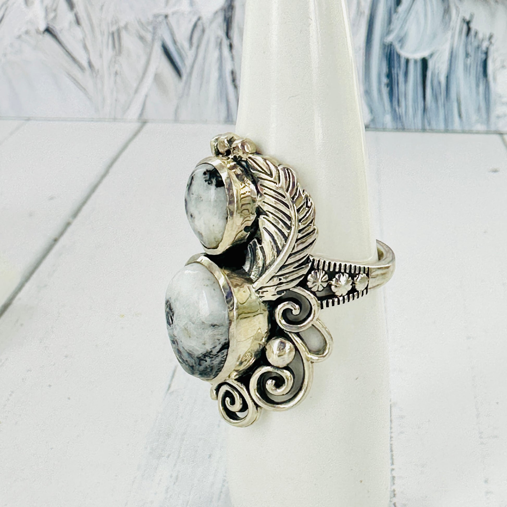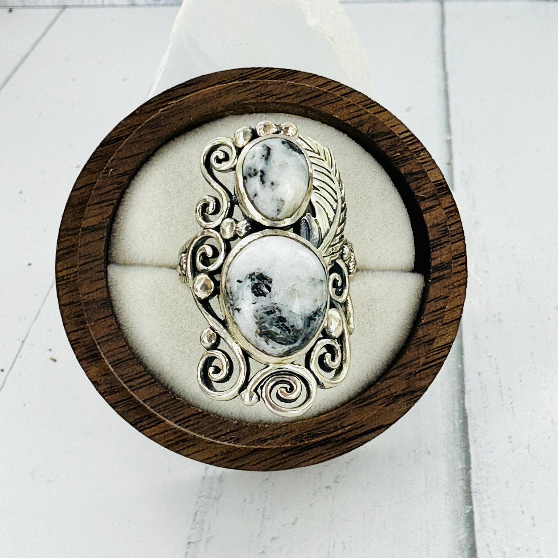 Embrace the spirit of the storm with this striking white buffalo stone ring. Two luminous white buffalo stones are artfully paired with a delicate feather and scroll design, all crafted in sterling silver. This statement piece measures 1.25" across, making it a bold yet wearable addition to any collection.