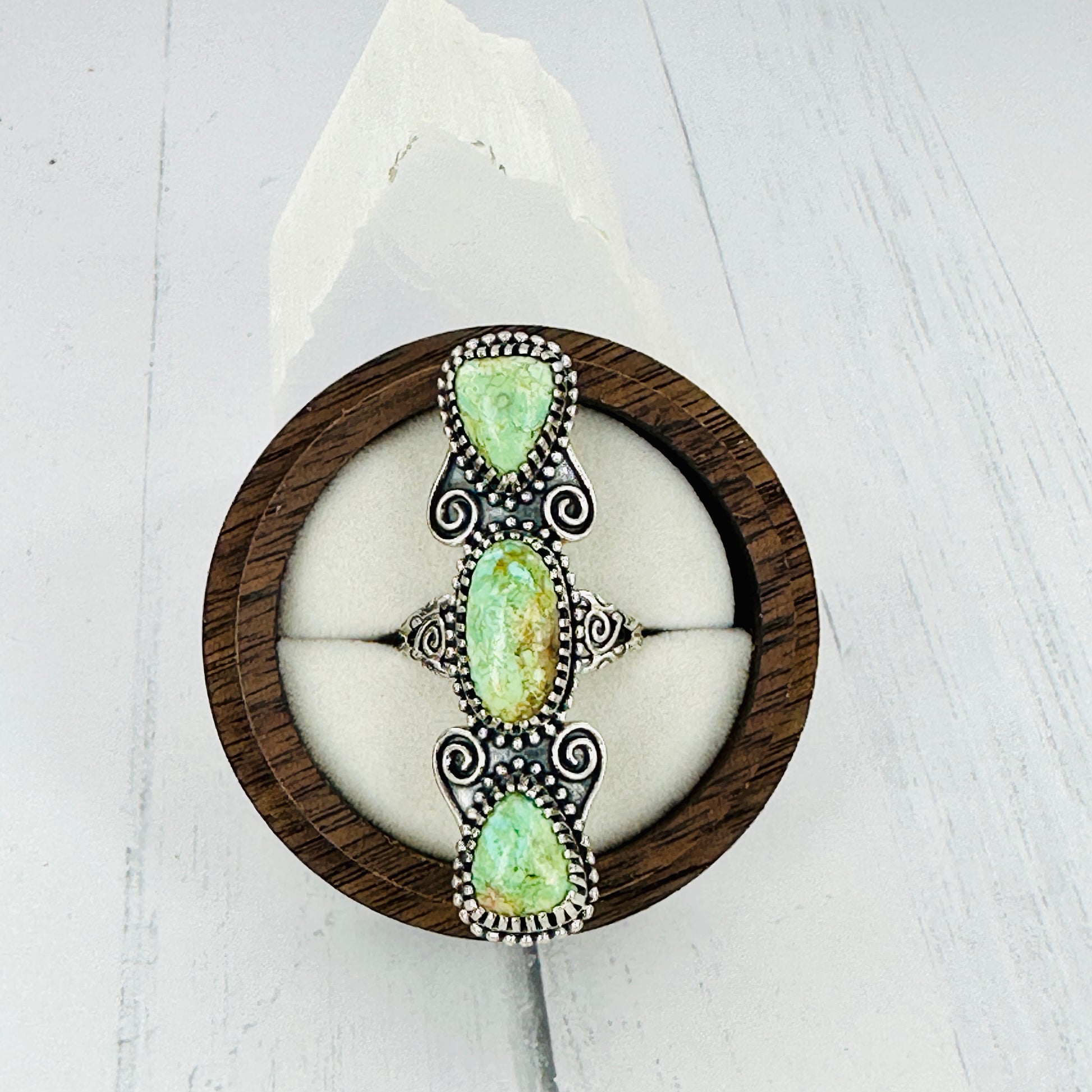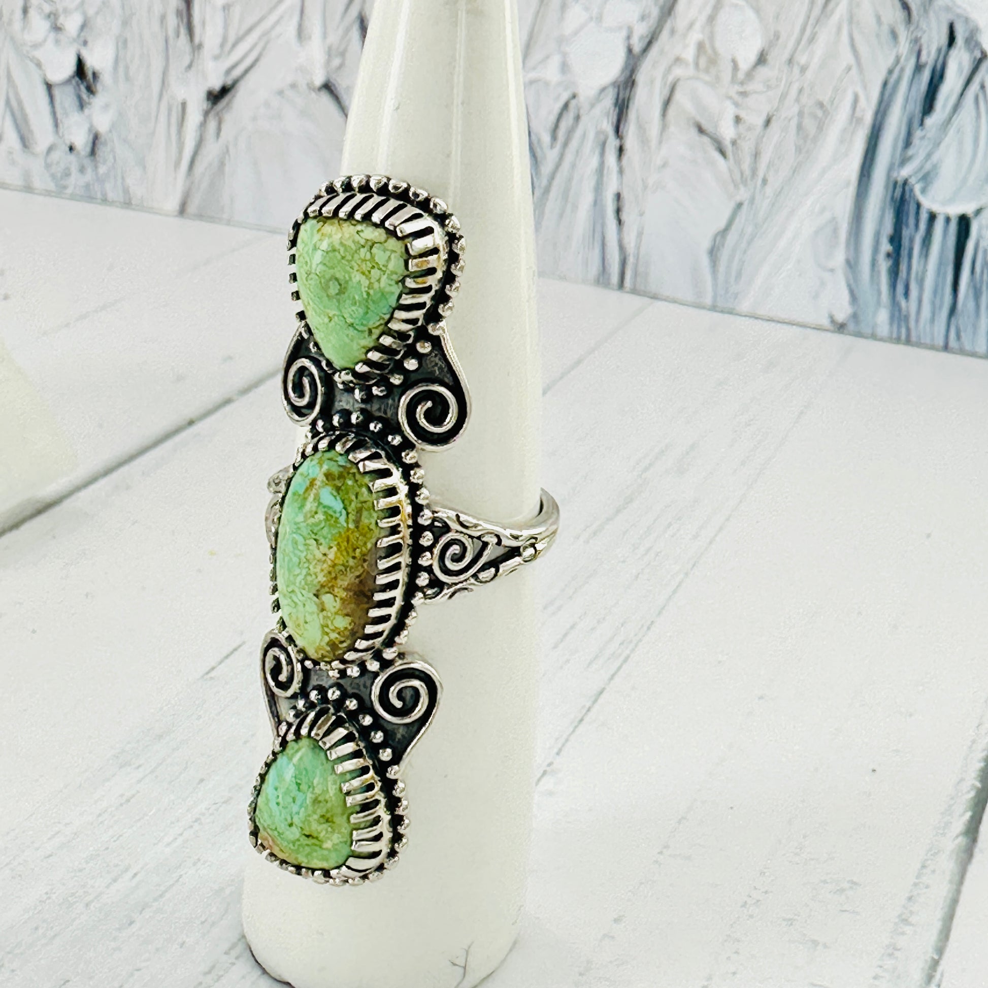Handcrafted sterling silver ring featuring three stunning Royston turquoise stones in rich green hues. Ring measures approximately 2 inches in length, showcasing the natural matrix patterns unique to Royston turquoise. The verdant green tones are set against polished sterling silver, creating an elegant and earthy aesthetic. Perfect for those who appreciate authentic gemstone jewelry with character and natural beauty. Size 7.